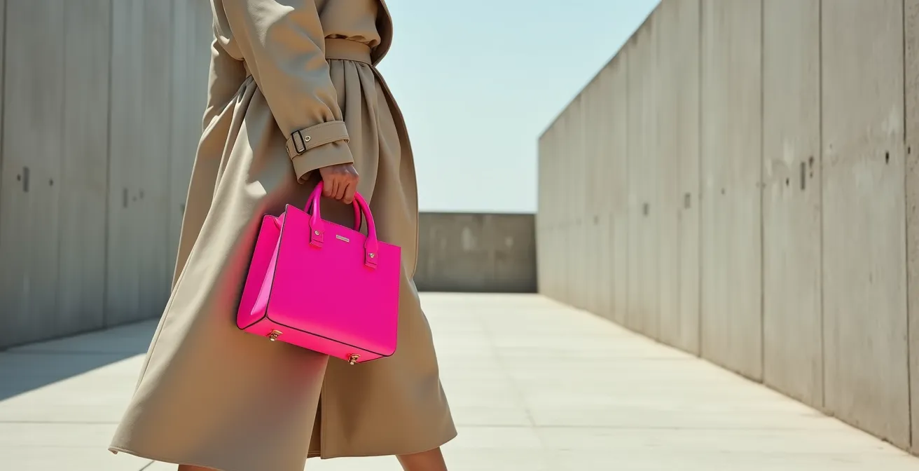 The classic beige trench coat is the perfect canvas for your first foray into neon. It’s a timeless, structured, and neutral garment that provides a sophisticated backdrop, preventing the neon from feeling overwhelming. The key is to treat the neon accessory not as a random addition, but as a strategic Visual Anchor—a single, deliberate point of focus that instantly modernizes the entire look.